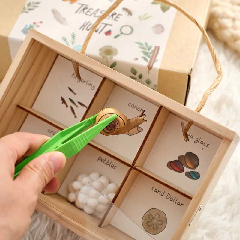 Invite your little one on a journey into the great outdoors with this beautifully curated nature exploration kit. Designed to spark curiosity and hands-on learning, this Montessori-inspired set includes a wooden observation box with dividers and a clear lid, binoculars, a magnifying glass, nature cards, wooden dice for object prompts, and tweezers for delicate discovery.